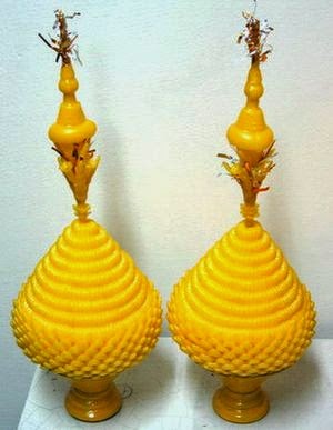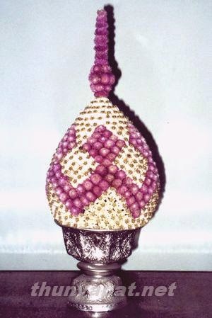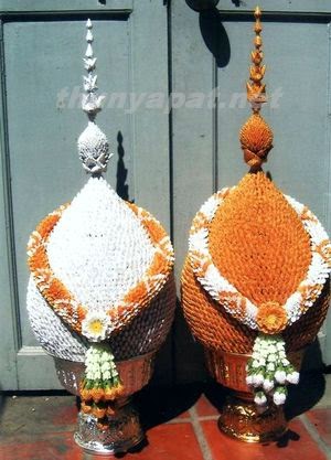 ![]() ๓. พานพุ่มทอง–พานพุ่มเงิน คือ การนำผ้าตาดทอง ตาดเงิน เป็นต้น มาประดิษฐ์ แล้วนำมา จัดแต่งประกอบกับวัสดุหรือโฟมเป็นทรงพุ่ม นำมาตั้งไว้บนพาน แล้วนำไปตั้งบูชาพระรัตนตรัย หรือ นำไปวางเป็นเครื่อง สักการะ แล้วแต่กรณี
